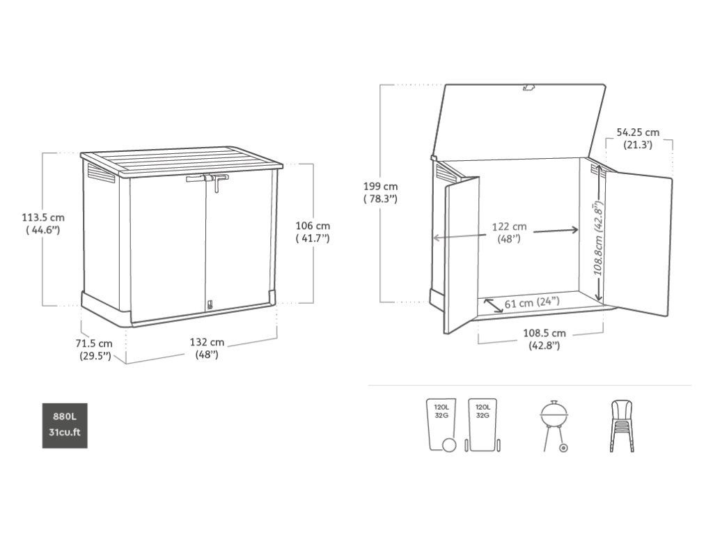 A STORE IT OUT MIDI tárolódobozt egyszerű és elegáns dizájn, univerzális szín és természetes fára emlékeztető felületi textúra jellemzi. Store-it-Out Midi Prime az ideális tárolási megoldás. 880 literes tárolóhelyet kínál, és könnyen összecsukható. Az éveken át tartó használatra készült tárolószekrény egyedi zárszerkezettel rendelkezik, amely lehetővé teszi az összes alkatrész összecsukását, vagy csak az ajtót, így a fedél továbbra is kinyitható. A Store-it-Out Midi Prime erős beépített padlópanellel rendelkezik, hogy tisztán és szárazon tartsa dolgait, valamint beépített polctartóval (a polc nem tartozék), hogy a legtöbbet hozhassa ki a tárhelyből. Sokféle dologra használható, és 2 db 120 literes tartálynak is használható.